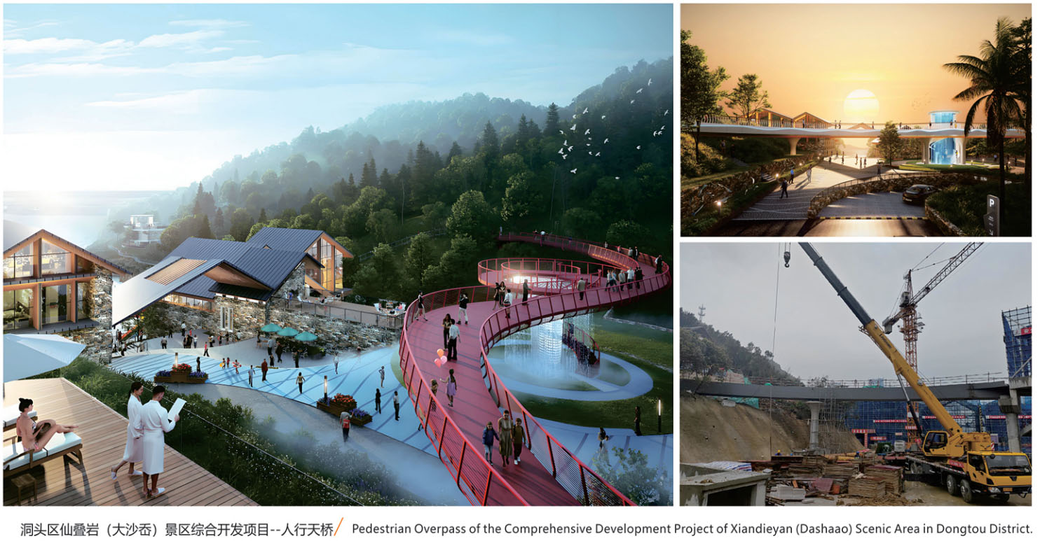 本項(xiàng)目位于仙疊巖(大沙岙)景區(qū)中心位置,橋梁橫跨山谷,懸浮于山海廣場(chǎng)之上,在完整連接了游玩棧道體系的同時(shí),解決了交通集散與轉(zhuǎn)換問(wèn)題。本項(xiàng)目橋梁整體呈弧線形布置,采用鋼箱梁橋方案。受限于道路及場(chǎng)地條件,對(duì)運(yùn)輸及吊裝方案要求高,施工方案經(jīng)專家論證后實(shí)施。