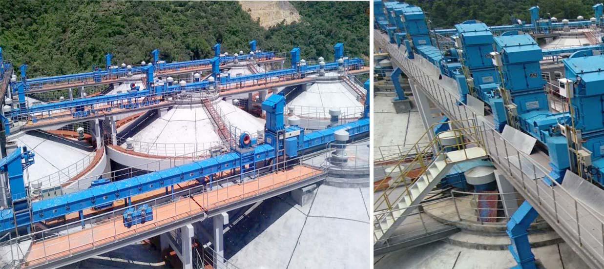 9個淺圓倉呈3排3列布置,其總平面尺寸為70m*70m,倉頂標(biāo)高為35.37m至38.87m,其中倉頂鋼格柵平臺標(biāo)高為35.37m,倉頂三條分連廊標(biāo)高為38.87m,一條主連廊標(biāo)高為41.42m,連廊大跨度8.9m,